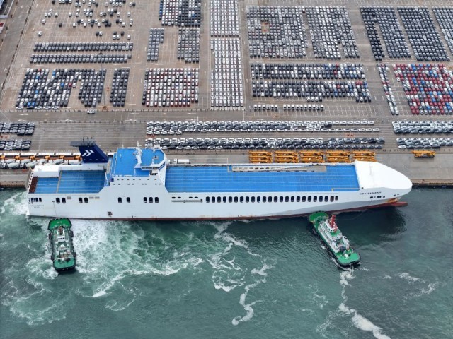 6月29日,汽车运输船停靠山东口岸烟台港,预备拆运出口汽车(无人机照片)。发(唐克 摄)“我国进出口曾经持续9个季度运转正在10万亿元以上,本年上半年进出口比客岁上半年添加了6000多亿元。进入6月份,进出口、出口、进口这三项目标同比全数实现正增加,”海关总署副署长王令浚暗示。
